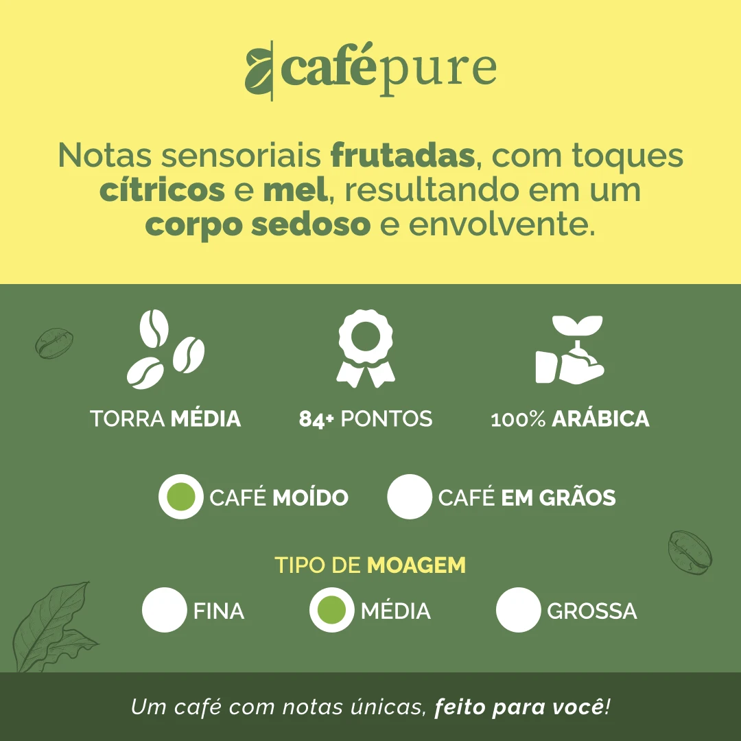 Já moído, está pronto para proporcionar praticidade sem comprometer a qualidade. Suas notas sensoriais são frutadas, com delicados toques cítricos e de mel, resultando em um corpo sedoso, envolvente e uma experiência única a cada xícara. Ideal para quem aprecia cafés sofisticados, que combinam tradição, sabor e aroma marcantes.